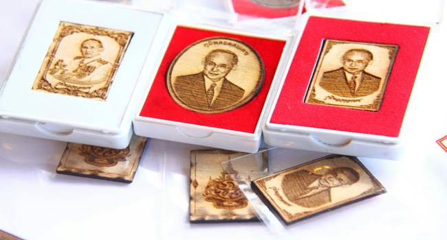 นายสุรินทร์กล่าวต่ออีกว่า การสลักเลเซอร์ครั้งนี้ทำจากเนื้อพญาไม้ซึ่งเป็นไม้เทพทาโร ถือว่าเป็นไม้มงคลที่เนื้อมีกลิ่นหอม ตามความเชื่อถือว่า ผู้ใดได้ครอบครองไม้มงคลนี้แล้วจะได้รับความโชคดี และถือเป็นศิริมงคลให้กับชีวิต การแจกครั้งนี้ทางคุณสุรินทร์ถือว่า เป็นการทำความดีถวายในหลวง และเพื่อเป็นขวัญกำลังใจแด่พี่น้องประชาชนทั่วไป