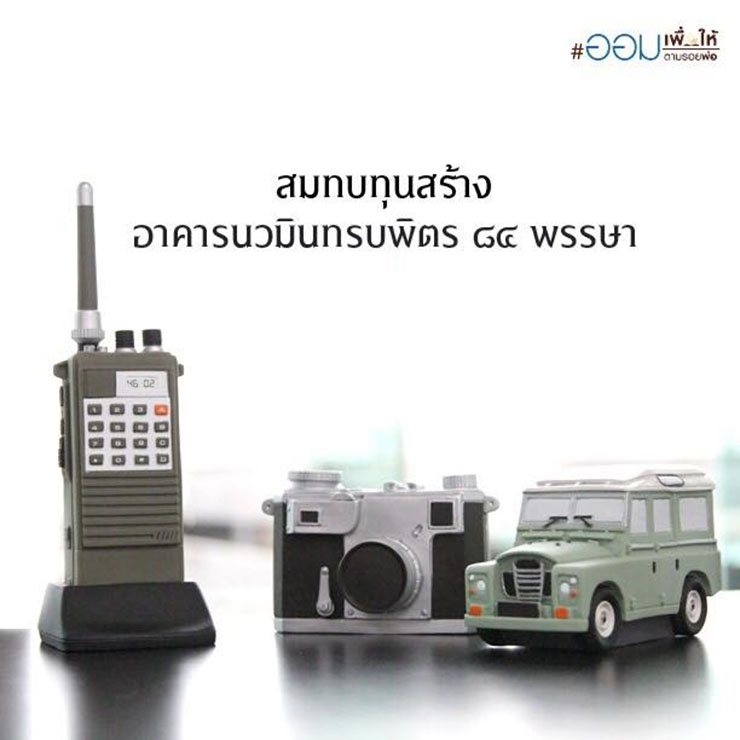 ให้แลกกระปุกวิทยุสื่อสารแบบแรก วันที่ ๒๘ ก.ค. – ๒๐ ส.ค. กล้องถ่ายรูป วันที่ ๒๑ ส.ค. – ๒๐ ก.ย. และพระราชพาหนะทรงงาน วันที่ ๒๑ ก.ย. ๒๐ ต.ค. นี้ เพื่อกระตุ้นการออมอย่างต่อเนื่อง หากต้องการสะสมครบ ๓ แบบ