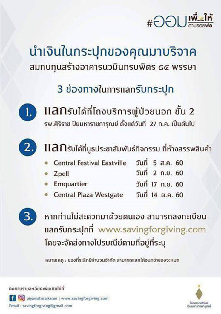 โรงพยาบาลศิริราช ชวนคนไทยนำเงินออมมาแลกกระปุกที่ระลึกสัญลักษณ์อุปกรณ์ทรงงานรัชกาลที่ ๙ สมทบทุนสร้างอาคารนวมินทรบพิตร ๘๔ พรรษา
