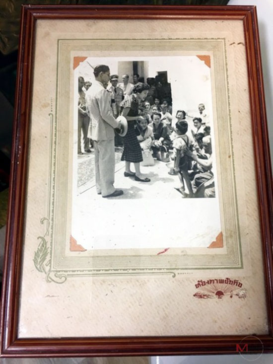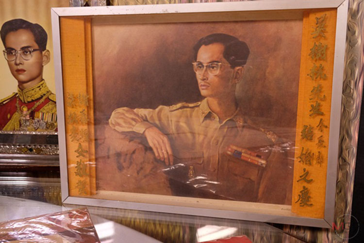 ส่วนภาพที่ผมประทับใจมากเลย เป็นภาพที่ในหลวง รัชกาลที่ ๙ ทรงผนวช ผมได้มาเป็นกรอบแป้งแล้วก็มีภาษาจีนเขียนไว้ด้านใน ของชิ้นนี้เจ้าของเป็นคนไทยเชื้อสายจีน เป็นของที่ระลึกรับขวัญวันแต่งงาน เพราะตามประเพณีของคนจีนคือ เมื่อแต่งงานไปแล้ว แล้วกลับมา จะต้องมีของชำร่วยให้คุณพ่อคุณแม่ฝ่ายชายและฝ่ายหญิง ในยุคปี พ.ศ. ๒๕๐๐ ต้นๆ เป็นสิ่งที่มีค่ามากๆ เลยครับ ซึ่งผมได้ให้คนจีนแปลให้เรียบร้อยแล้ว ก็จะแปลว่า “มาคารวะท่านพ่อท่านแม่จากลูกสาวหรือลูกเขยที่มอบให้กับคุณพ่อคุณแม่ครับ” ซึ่งผมว่าภาพนี้บ่งบอกถึงความสัมพันธ์ระหว่างคนไทยและคนจีนได้ดีมาก นอกจากนี้แล้ว ทุกชิ้นก็ล้วนแต่มีคุณค่าทางจิตใจกับผมมากครับ
